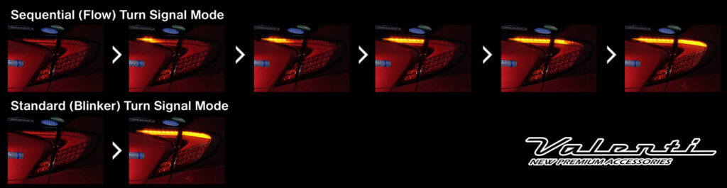 Pictured: Red Lens/Black color option in sequential (flow action) and standard (blinker) turn signal modes. See the video above for more detail.